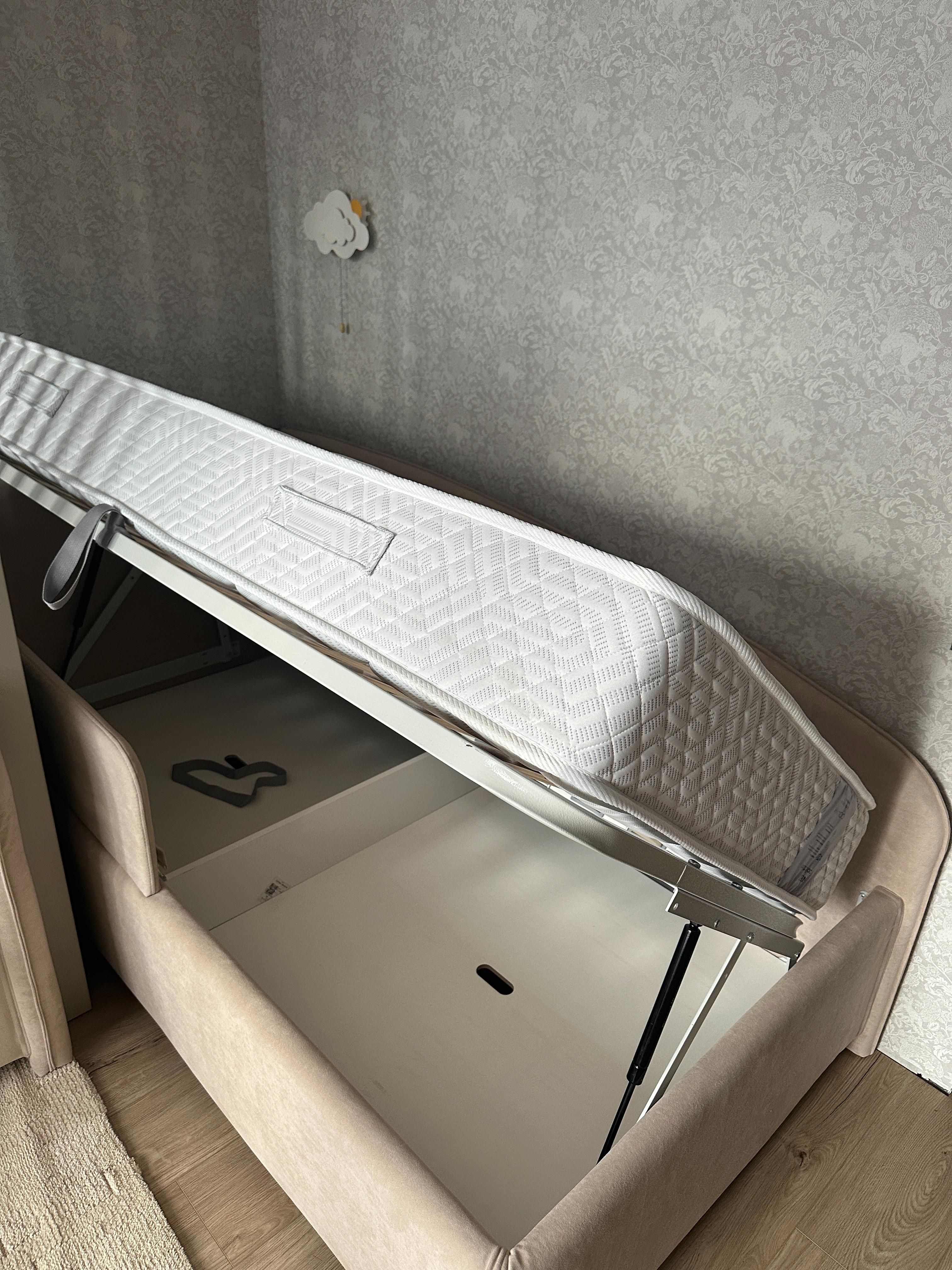 Кровать очень стильно выглядит, прям как из Pinterest, давно такую искала. Долго выбирала и остановилась на этом экземпляре. В приоритете был подъемный механизм, большой ящик, мягкая основа. И большая спинка со стороны головы. Отличная ткань, всё крепкое и надёжное. Комплектом к кровати взяли матрас. Просто идеальный, прошит аккуратно, чистый, соответствует всему заявленному, стал любимым местом семьи. Этикетка производителя на месте, всем советую такой матрас, совсем не пожалела, что купила такое спальное место.